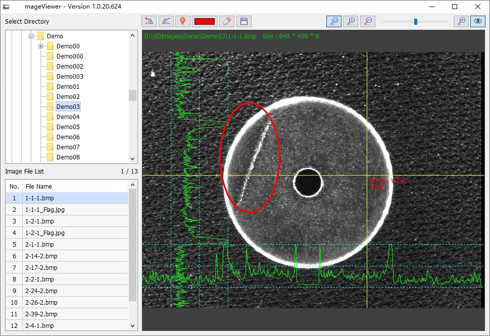 该软件是一款面向工业自动化机器视觉领域的图像浏览器, 其主要技术特点如下: 1)支持工业机器视觉邻域超大图像浏览,图像最大支持图像尺寸65535 x 65535; 2)支持机器视觉领域常见的图像格式,包括JPG、BMP、PNG、TIF和易渊图像自定义RAW格式; 3)支持任意调整图像显示缩放比例;支持图像90度旋转; 4)支持通过鼠标查看图像上像素信息; 5)支持图像圈注然后自动保存原文件名+Flag后缀的圈注图像。