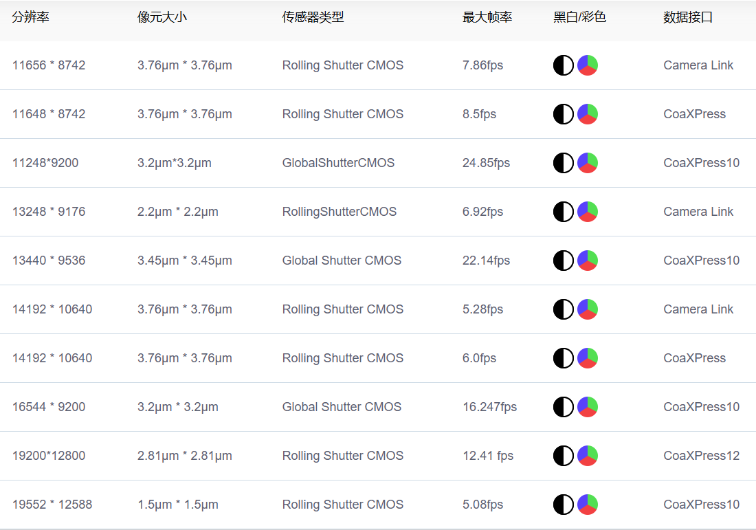 分辨率1.01-13.59亿像素,支持Camera Link、CoaXPress等数据接口,支持黑白、彩色图像模式,最高帧率可达24fps,支持像素合并、平场校正、视差矫正、空间校正等多种算法处理技术,支持电子制冷功能。